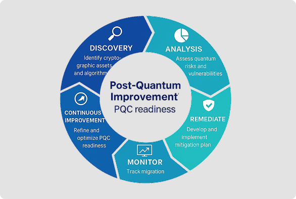 Quantum readiness is never a one-time project. As standards mature and threats evolve, organisations refine their cryptographic strategy and optimise their PQC rollout. Continuous Improvement ensures long-term resilience by keeping cryptographic assets updated, aligned to new PQC standards, and ready for future quantum-resilient protocols.
